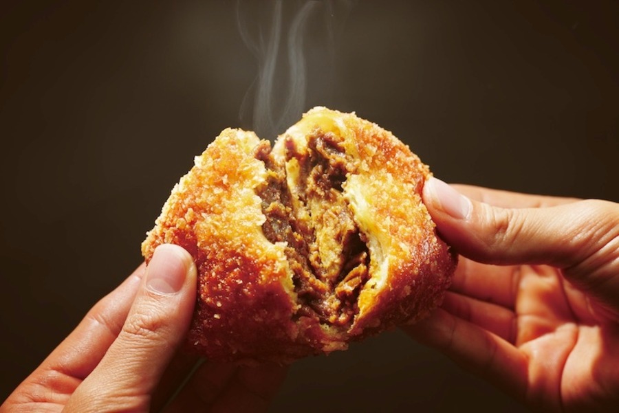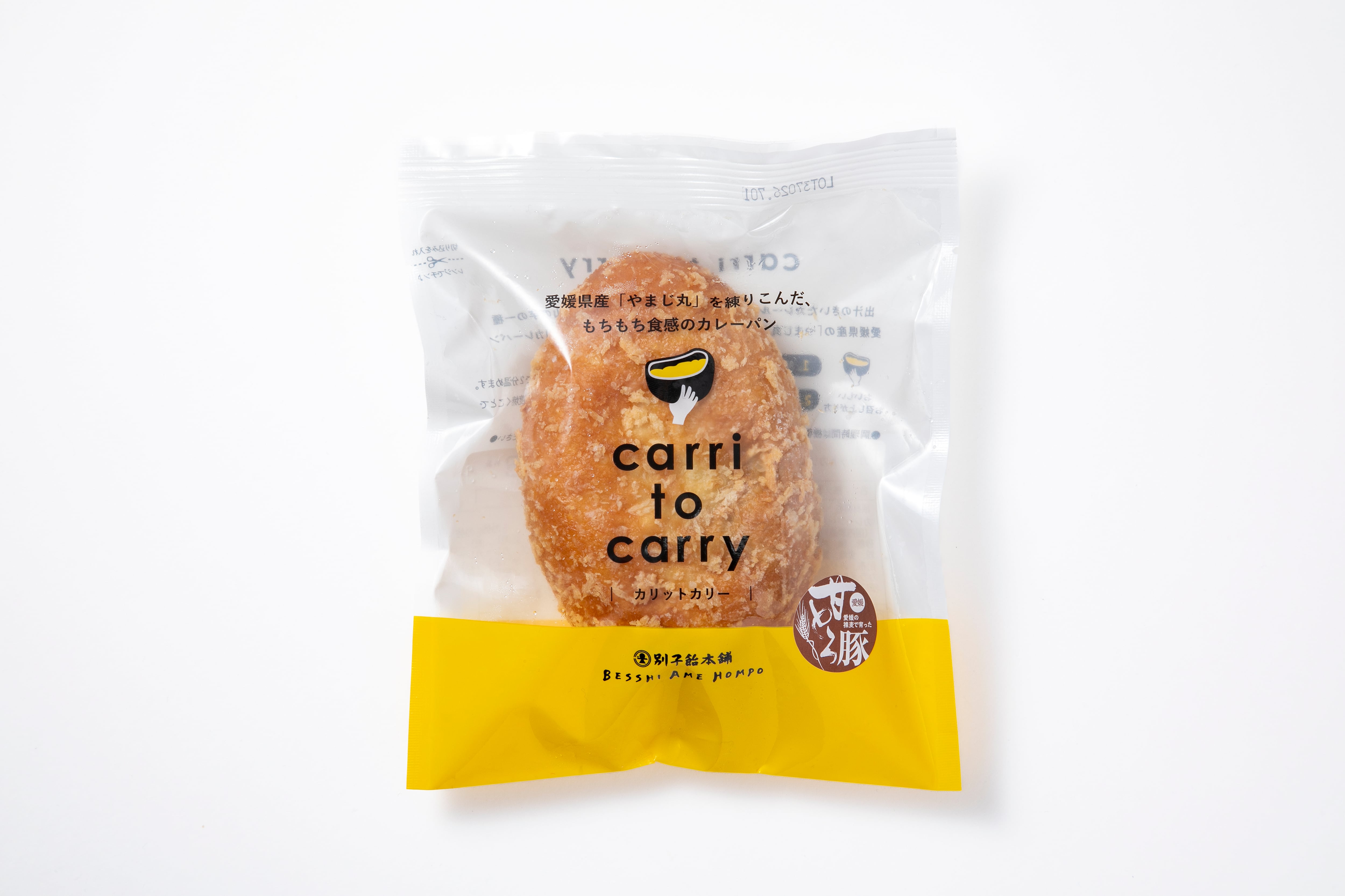 出汁のきいたカレールーと旨味を引き出す具材、生地には粘りが強い愛媛県産山の芋JAうま特産「やまじ丸」を練り込みもちもち食感、中具には愛媛県産はだか麦で飼育された愛媛県ブランド豚「甘とろ豚」を入れこめ油で揚げたもっちりカリカリのカレーパン。