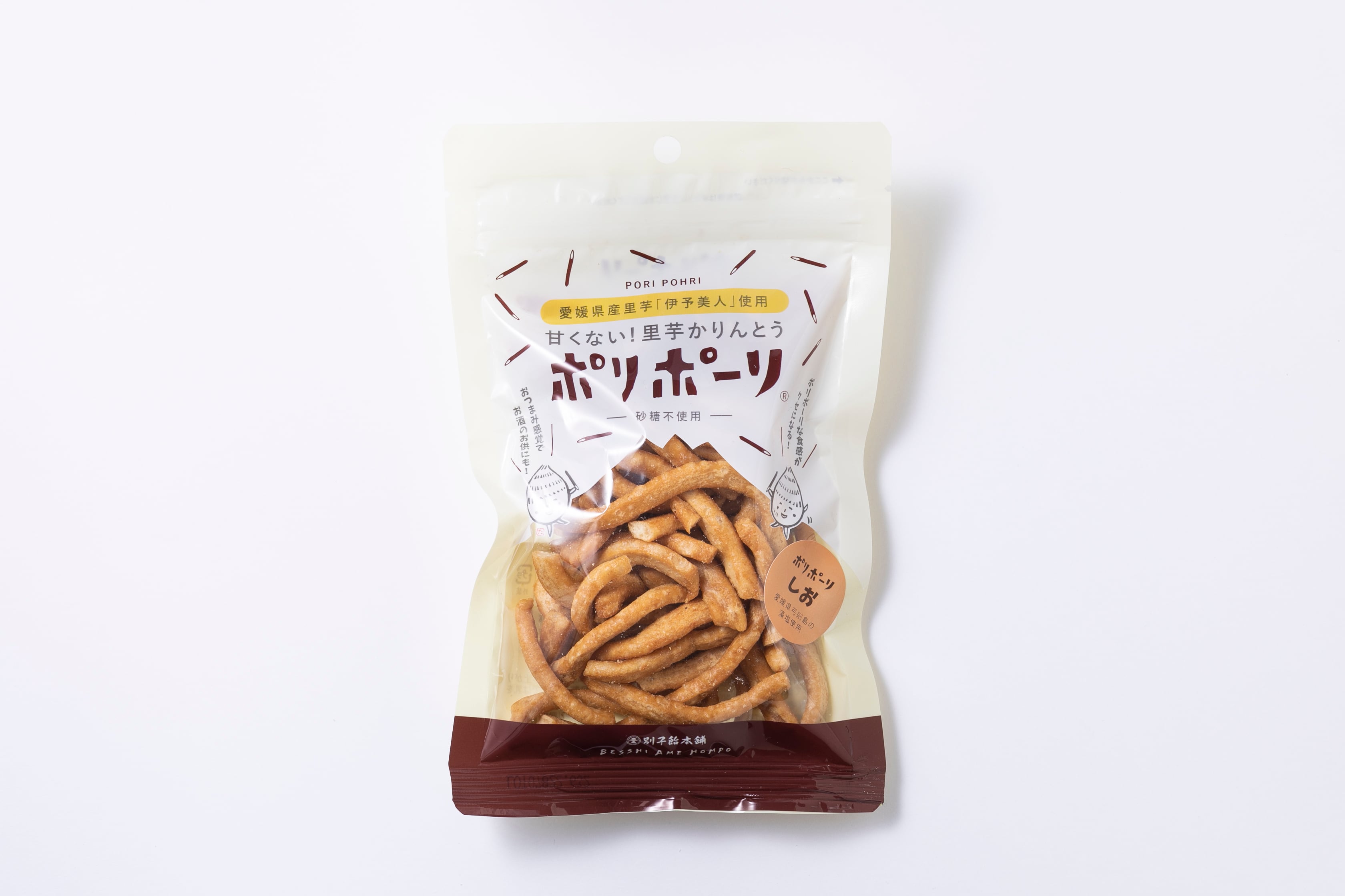 石鎚山系の豊かな伏流水と瀬戸内の温暖な気候で育てられた愛媛県のブランド里芋「伊予美人」を練り込んでこめ油で揚げた甘くないかりんとうです。