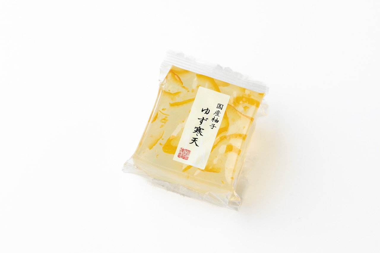 商品特徴:上部には愛媛県産ゆず皮を浮かべ、弾力のある寒天独特の食感との違いもお楽しみください。